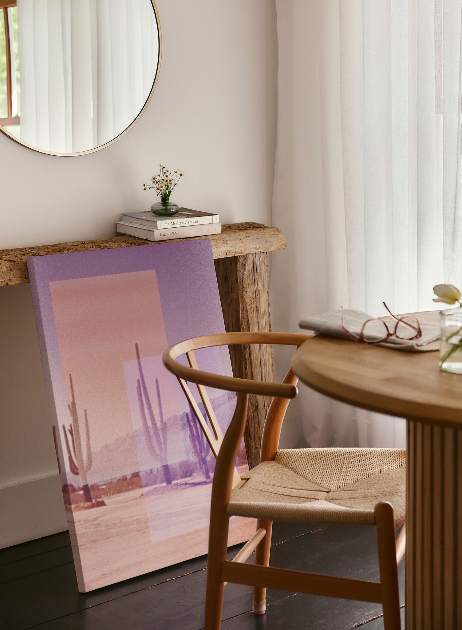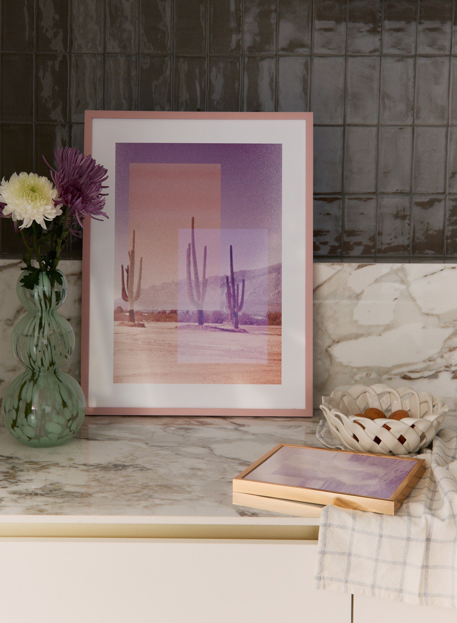 Desert heat, but make it disco! This cool collage is composed of a photo of cacti layered with translucent pink and purple rectangles.