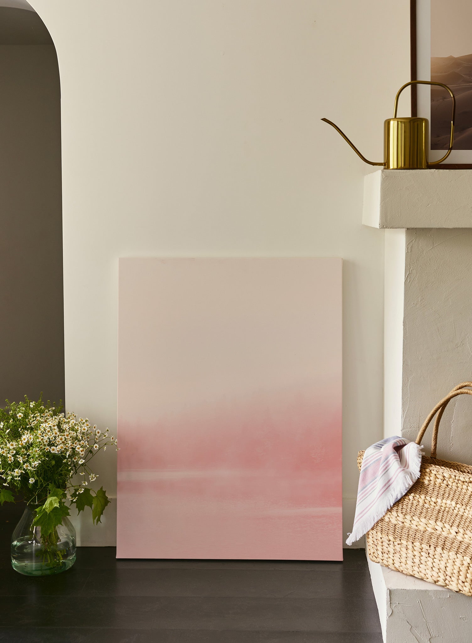 The Lakehouse at Dawn poster evokes sweet memories of faraway summers. This vintage photo has a distinct grainy pink tint, and depicts a lake and forest in the mist.